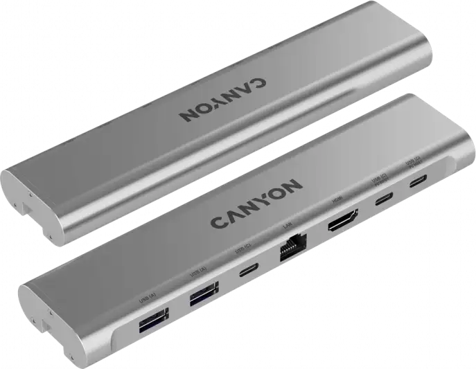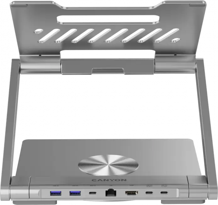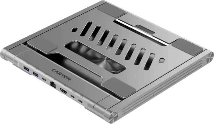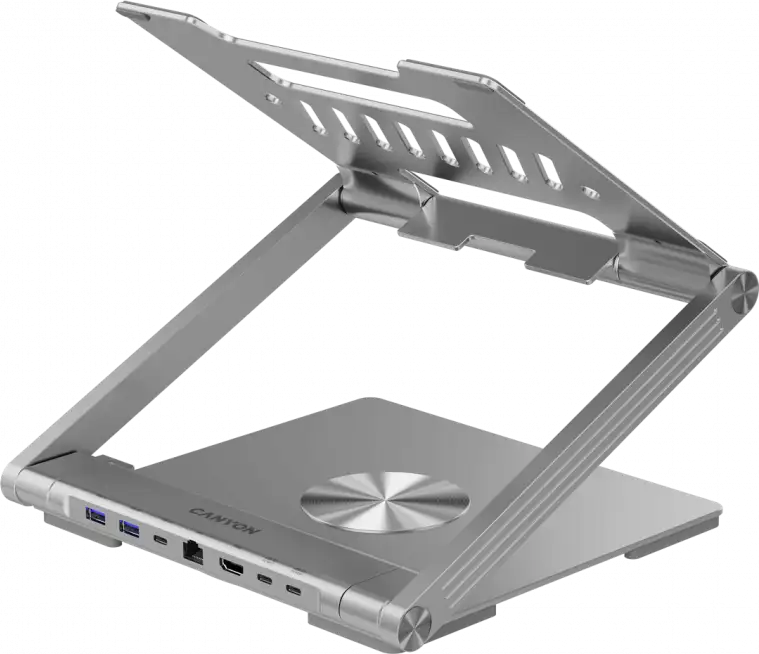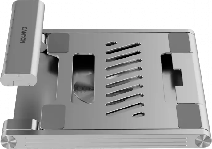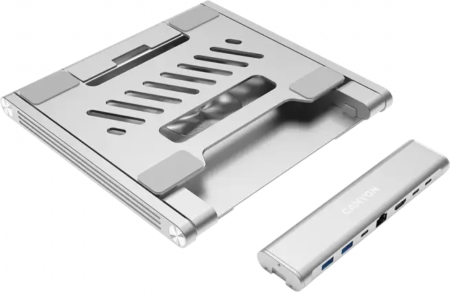 Canyon Laptop stands with hub, TYPE C F to HDMI2.0+2USB3.0+USBC3.0+RJ45+PD, TYEP C TO C cable 1m white with Emarker: HUSB332A, Material: Aluminum case+ABS+PS, Size: 245x240x27.2+/-0.3mm, Weight:1304g