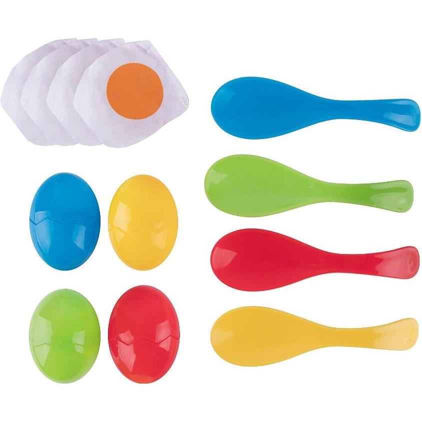 Bez pada i razbijanja jajeta! Igra sadrži 4 ljuske jajeta, 4 pečena jaja od tkanine, 4 žlice različitih boja i 1 vrećicu za spremanje igre.