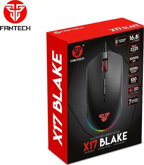 Senzor: Gejmerski senzor PixArt 3325 Ubrzanje: Do 100 IPS / 20G DPI: On-the-fly od 200 do 10.000 DPI Polling Rate: 1000 Hz Životni vijek: 20 milijuna klikova (Huano prekidači) RGB: Da (16.8 milijuna prilagodljivih boja) Tipke: 7 nezavisno prilagodljivih Kabl: Pleteni najlonski kabl dužine 1.8 m Dimenzije: 125*62*42 mm Gejmerski miš FANTECH BLAKE X17 opremljen je sa 7 nezavisno prilagodljivih tipki. Kabl dužine 1.8 m od pletenog najlona osigurava stabilnu i čvrstu povezanost te brz prijenos podataka, a uz do 10.000 DPI budite spremni napraviti prave poteze u bilo kojoj situaciji u igrici. Brzo prođite kroz DPI postavke za brz odabir on-screen postavki ili za skeniranje mape igrice (do 10000 DPI). Za još uzbudljivije gaming iskustvo, odaberite između 7 RGB režima boja.