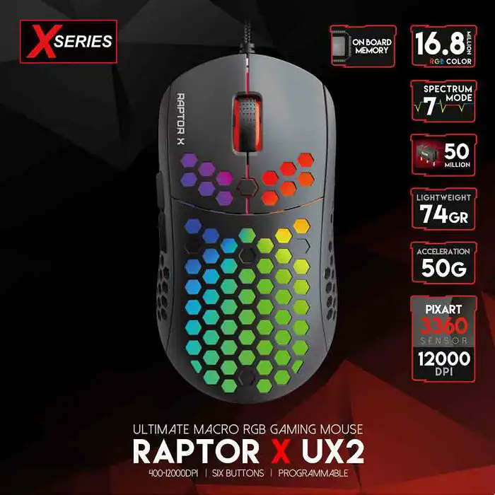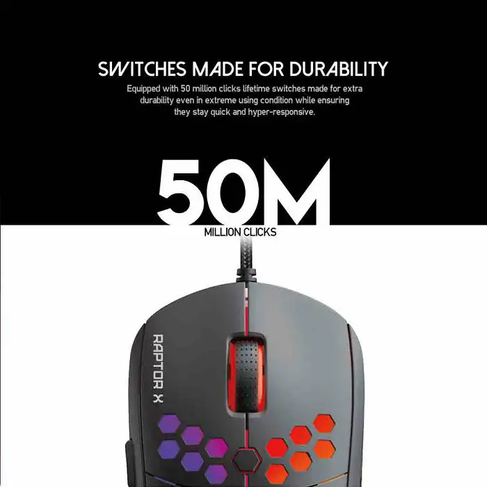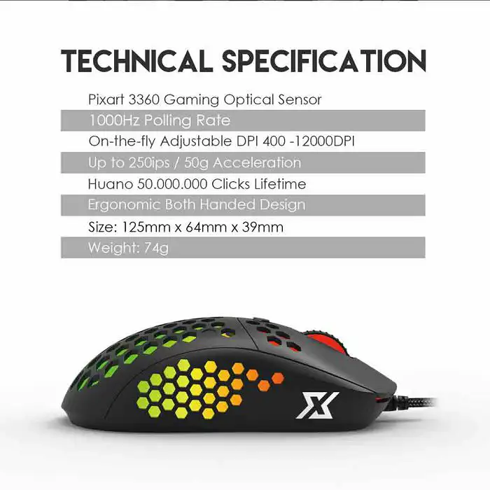 Senzor: PixArt 3360 optički senzor Ubrzanje: do 250 IPS / 50G DPI: on-the-fly podesivi DPI 100-12,000 DPI Polling Rate: 1000Hz Životni vijek: 50 milijuna klikova (Huano prekidači) + šest neovisno programabilnih tipki Osvjetljenje: naizmjenično RGB svijetlo sa 7 RGB moda Kabl: Paracord USB kabel od 1,6 m Veličina: 125 mm x 64 mm x 39 mm