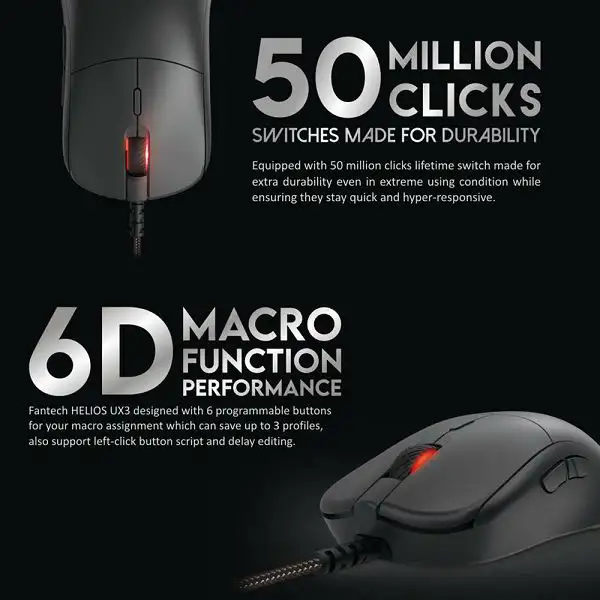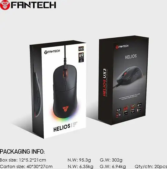 Gejmerski senzor: PixArt PMW 3389 Ubrzanje: Do 400 IPS / 50G DPI: On-the-fly od 400 do 16000 Polling Rate: 1000 Hz Životni vijek/broj klikova: 50 milijuna klikova (Huano prekidači) RGB: Running RGB sa RGB modovima Kabl: Paracord 1.8 m Veličina: 120*58*38 mm Boja: crna Gejmerski miš FANTECH HELIOS UX3 CRNI opremljen je PixArt PMW 3389 senzorom koji zadovoljava standarde E-sport industrije. Paracord kabl duljine 1.8 m je ultra fleksibilan i lagan te ostavlja dojam gotovo bežičnog miša.