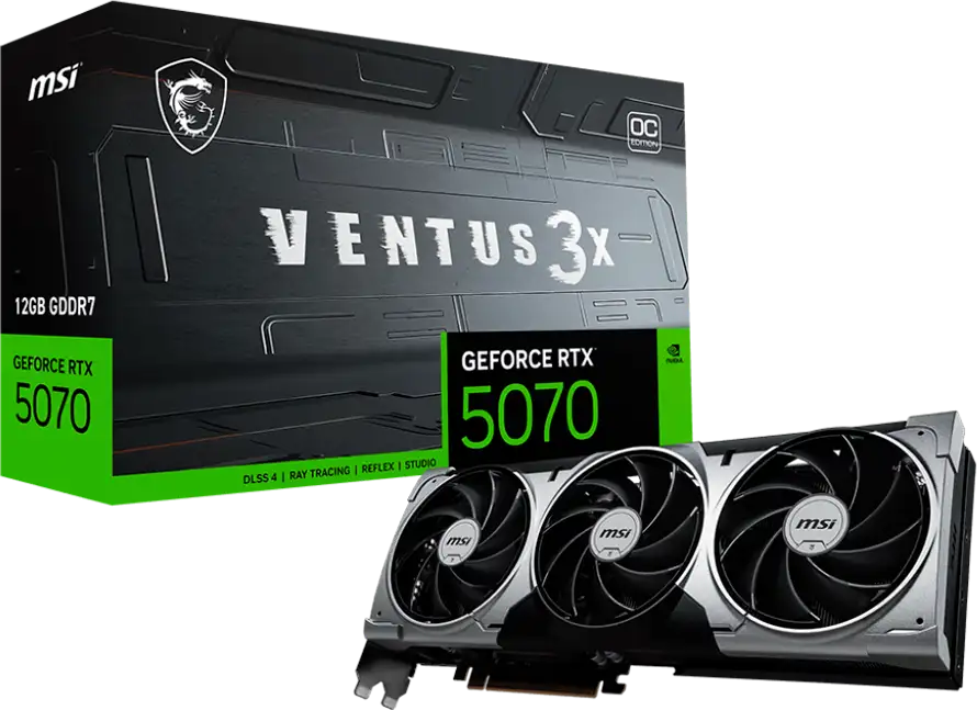 MSI Video Card NVIDIA GeForce RTX 5070 12G Ventus 3X OC – 12GB GDDR7 (28Gbps/192-bit), PCIe 5X 16, Boost: 2542 MHz, HDMI 2.1b, DisplayPort 2.1b