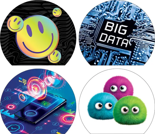dimenzija: 21×24 cm; polukružna; donja strana: protuklizna podloga od polivinila s pjenastom teksturom; gornja strana: prozirna reflektirajuća folija od polivinila; sredina: papir ispisan u punoj boji