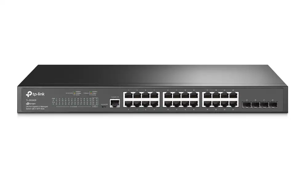 TP-Link SG3428 Omada 24-Port Gigabit L2+ Managed Switch with 4 SFP Slots, 24× Gigabit RJ45 ports and 4× Gigabit SFP slots, Omada APP, Static Routing, VLAN, ACL, QoS, IGMP Snooping, OAM, DDM, ERPS, Fanless, 1U, Zero-TouchProvisioning, ERPS
