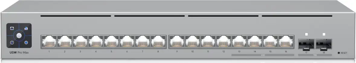 Ubiquiti Networks USW-Pro-Max-16 – Ubiquiti Pro Max 16 is a new L3 switch that offers 4x 2.5 Gbps and 12x 1 Gbps ports. For optical interface connection, there are 2 SFP ports achieving speeds up to 10 Gb s. The switch is powered via a USB-C 5V DC 25W