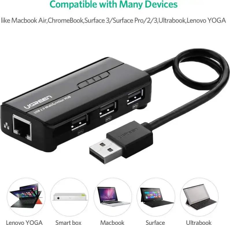 UGREEN 4-portni USB-A HUB 1xEthernet, 3xUSB-A 2.0, 100Mbps, crni