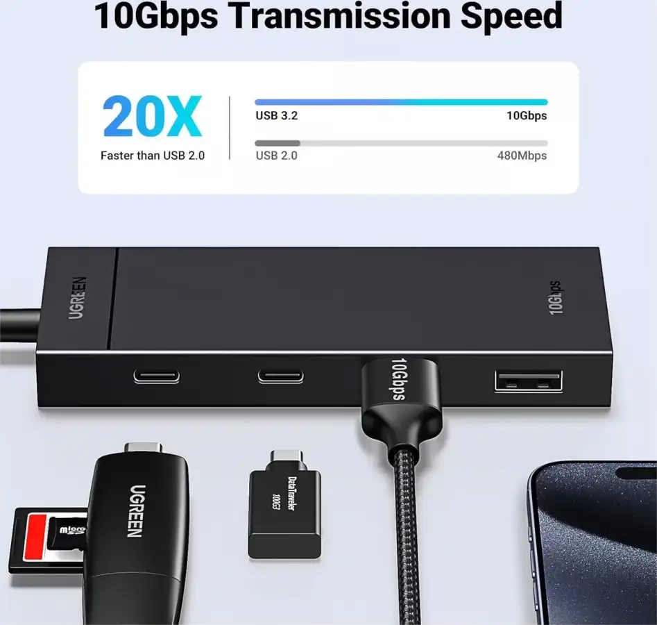 USB C razdjelnik s 4 priključka: 4-u-1 USB C čvorište pretvara jedan od USB-C priključaka vašeg prijenosnog računala u 2 USB-C 3.2 i 2 USB-A 3.2 podatkovna priključka. Savršeno povežite sve svoje USB periferne uređaje u svakodnevnom tijeku rada kako biste zadovoljili svoje sadašnje i buduće potrebe. (Napomena: USB-C priključci ne podržavaju video izlaz ili punjenje)Prijenos podataka od 10 Gbps: USB C 3.2 čvorište s 4 priključka podržava brzinu prijenosa podataka do 10 Gbps. To je dovoljno brzo za prijenos datoteke od 20 GB u samo 16,4 sekunde, što uvelike štedi vaše vrijeme čekanja.Plug and Play: nisu potrebni dodatni upravljački programi ili softver. USB C multiport adapter je plug and play za Windows 11/10/8.1/8/7/Vista/XP, macOS, Linux, iPadOS, iOS i Android.Široka kompatibilnost: USB C na USB adapter je kompatibilan s većinom USB-C ili Thunderbolt uređaja kao što su MacBook Pro/MacBook Air, iPad/iPad Pro/iPad Air/iPad Mini, iPhone 15/15 Pro Max, Surface Pro, XPS 15/13, Galaxy S23/S22/S21 i drugi pametni telefoni/prijenosna računala/tableti/osobna računala.Kompaktan i lagan: s veličinom od 4 x 1,5 x 0,5 inča i težinom od 50 g, USB C ekstender s 4 priključka ultra je kompaktan i lagan. Savršeno za putovanje ili ponošenje u ured.Specifikacije – Ulaz: USB C 3.2 (M) – Output: USB 3.2 A (Ž) × 2, USB 3.2 C (Ž) – Brzina: up to 10 Gbps – Podržava 12TB hard disk – Plug & play – Kompatibilnost: Windows, macOS, Linux, iPad, iOS, Android – Napomena: HUB je za prijenos podataka, ne za punjenje