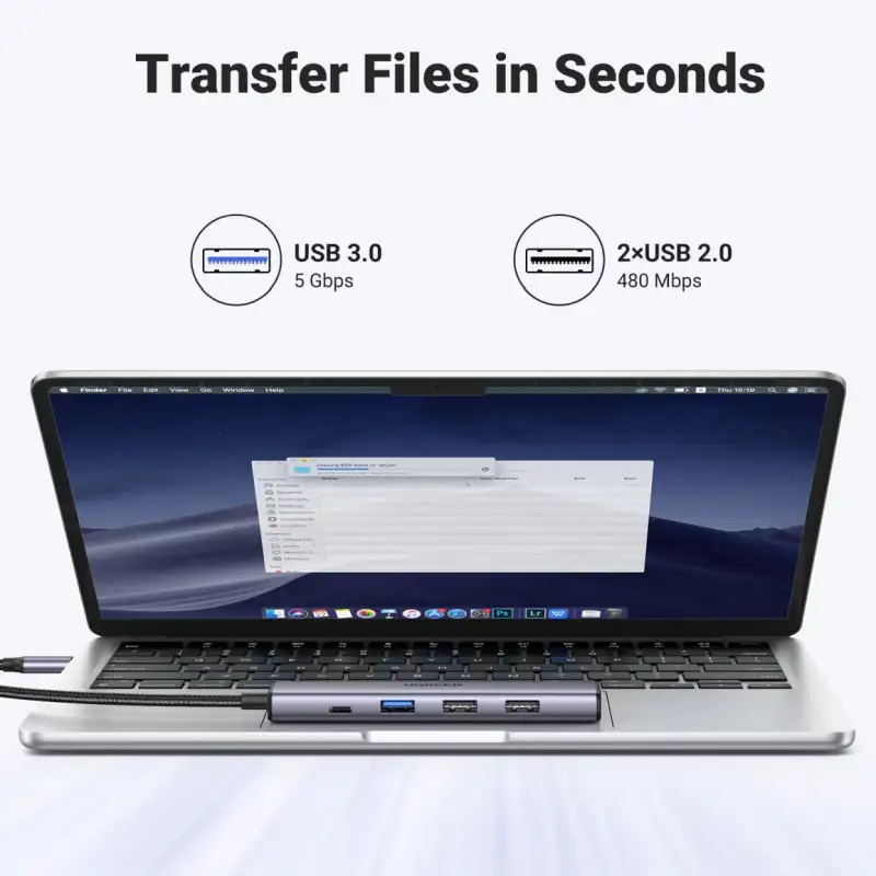 Punjenje od 100 W: – UGREEN USB C Hub ima 100 W USB-C PD priključak za brzo punjenje prijenosnog računala kod kuće ili u pokretu.4K zaslon: – Uživajte u zapanjujućem 4K@30Hz medijskom prikazu putem HDMI priključka, pružajući detaljne i živopisne slike.Brzi prijenos datoteka: – Prenesite datoteke brzinom do 5 Gbps na USB-A 3.0 priključak, s dva dodatna USB-A 2.0 priključka za tipkovnice i miševe.5-u-1 povezivost: – Ovaj USB-C višeportni adapter nudi svestranu kombinaciju priključaka, uključujući HDMI, USB-C PD, USB-A 3.0 i dva USB-A 2.0 priključka.Izdržljiv i kompaktan: – Izrađen od izdržljivog aluminija i CNC obrade, ovaj USB Type-C Hub je lagan, teži samo 58 g, što ga čini savršenim za korištenje u pokretu.Specifikacije – SKU: 15495 – Serija: Revodok105 – Priključci: 5 – ExtendedMonitor: 1 – DataPortovi: * 1 (USB-A 3.0) * 2 (USB-A 2.0) – Brzina prijenosa: 5 Gbps – DisplayPort: 1 (HDMI 1.4) – Maks. razlučivost zaslona: 4K 30Hz – Priključak za punjenje: 100W – Dimenzije proizvoda: D 110xŠ 195xV 23 (mm) – Težina artikla (g): 100