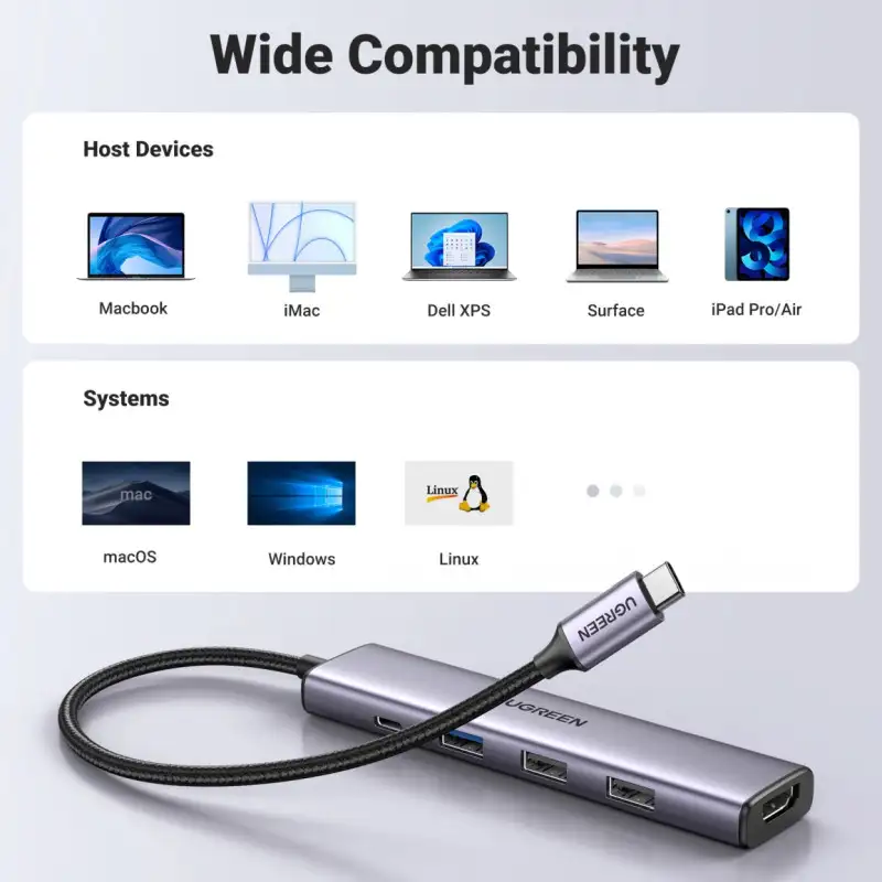 UGREEN 5-portni Revodok 105 USB-C HUB, 3xUSB-A, 1xUSB-C 100W PD, 1xHDMI 4K 30Hz, sivi
