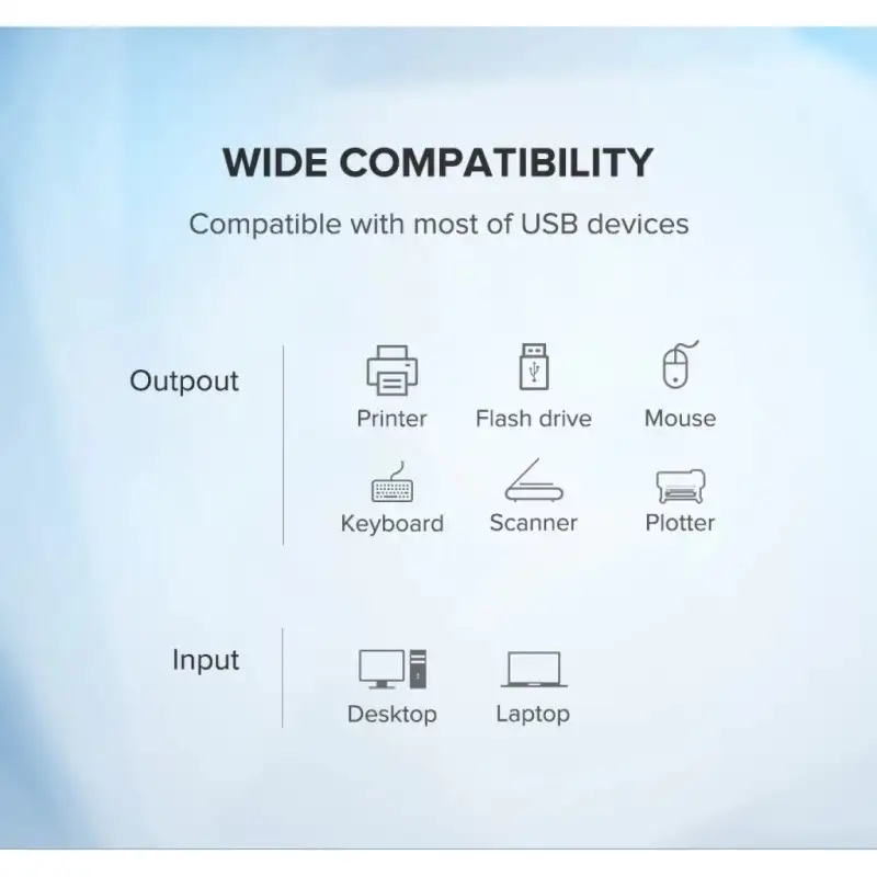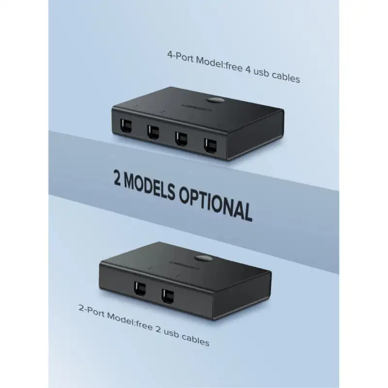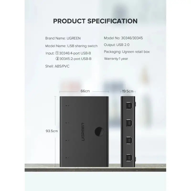 Specifikacije – Ulaz: USB-B priključak x 4 za računalo (jedno računalo ima pristup); – Izlaz: USB-A priključak x 1 za uređaj; – Brzina do 480 Mbps – ABS kućište – Uključuje četiri USB-B na USB-A kabela od 1,5 m; – Napomena: Duljina od računala do uređaja ne smije prelaziti 4,5 m – Podržava Windows XP/7/8/10/Vista, MAC OS 8.6 i novije verzije; – Plug and Play, nije potreban upravljački program; – Dimenzije: 93,5 mm x 66 mm x 19,5 mm.