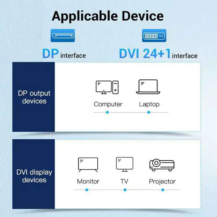 DP na DVI kabel Vodič: kositrena bakrena žica Zaštita: aluminijska folija + pletivo Rezolucija: 1080P 60Hz Vanjska zaštitna ovojnica: PVC + ABS