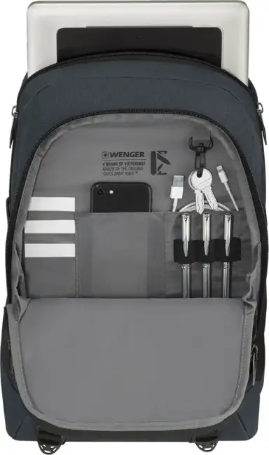 Značajke – 2 vanjska bočna džepa s patentnim zatvaračem – Držač kemijske olovke – Nosač za ključeve – Džep za prijenosno računalo od 15 inča – Džep za tablet širine do 22 cm – Metalni patentni zatvarači – Glavni pretinac s patentnim zatvaračem – Pretinac s patentnim zatvaračem s džepom za organizator – Podesive naramenice s omčom za naočale – Ručka za nošenje ruksaka – Ergonomski naslon sa sustavom cirkulacije zrakaSpecifikacije – Težina (kg): 0.55 – Dimenzije: 35 x 45 x 19 – Materijal: Poliester – Volumen (L): 25 – Proizvođač: Wenger, Švicarska – Boja: Crna